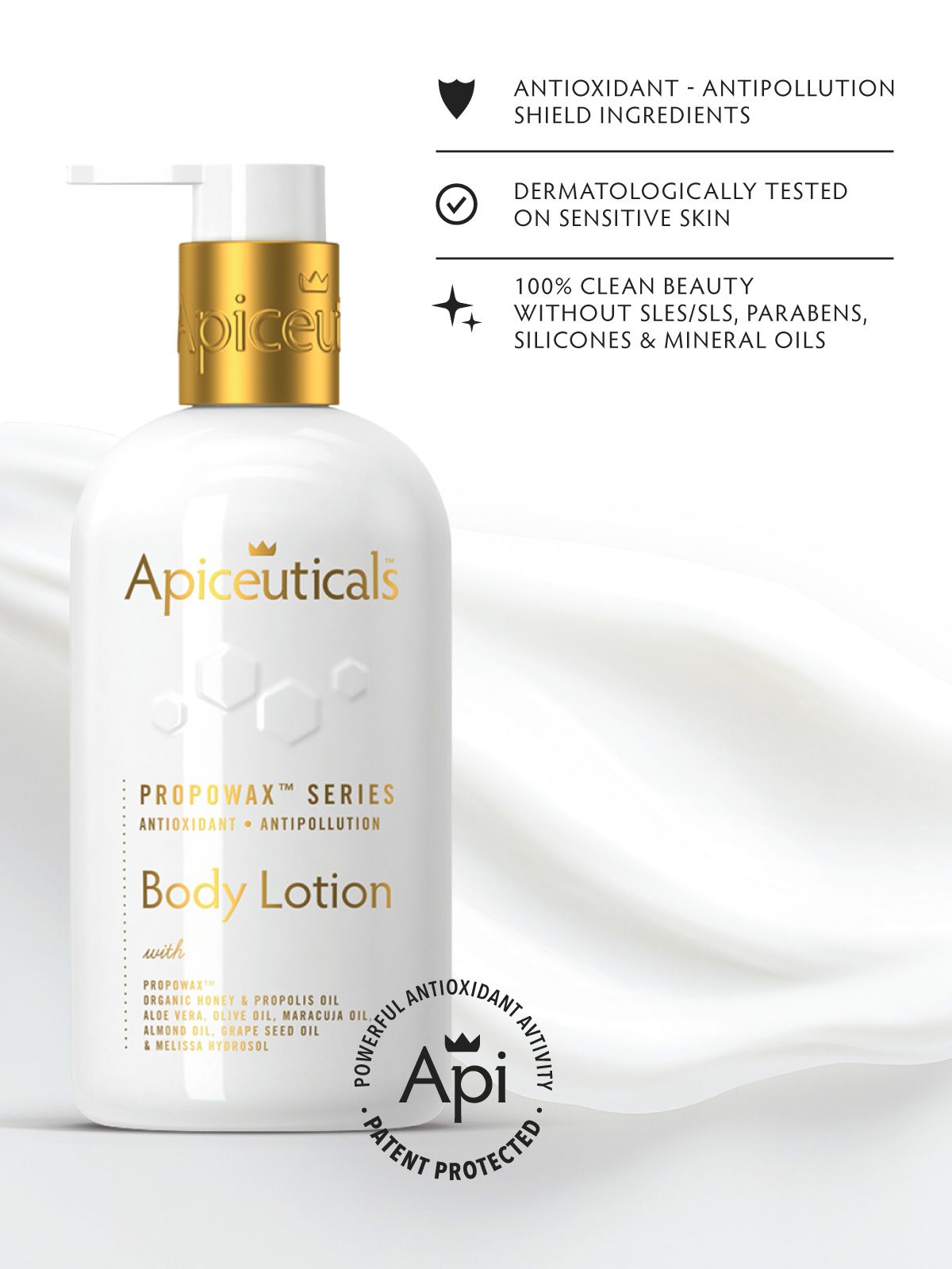Bagātināts patentēto PROPOWAX™ Dzīvo medus šūnu, ar pierādīti augstāko antioksidantu aktivitāti pasaulē, tas notur mitrumu, atjauno ādas aizsargbarjeru un pasargā no piesārņojuma un oksidatīvā stresa. Tā vieglā, netaukainā tekstūra padara ādu samtaini maigu, elastīgu un ietītu Apiceuticals raksturīgajā luksusa aromātā.