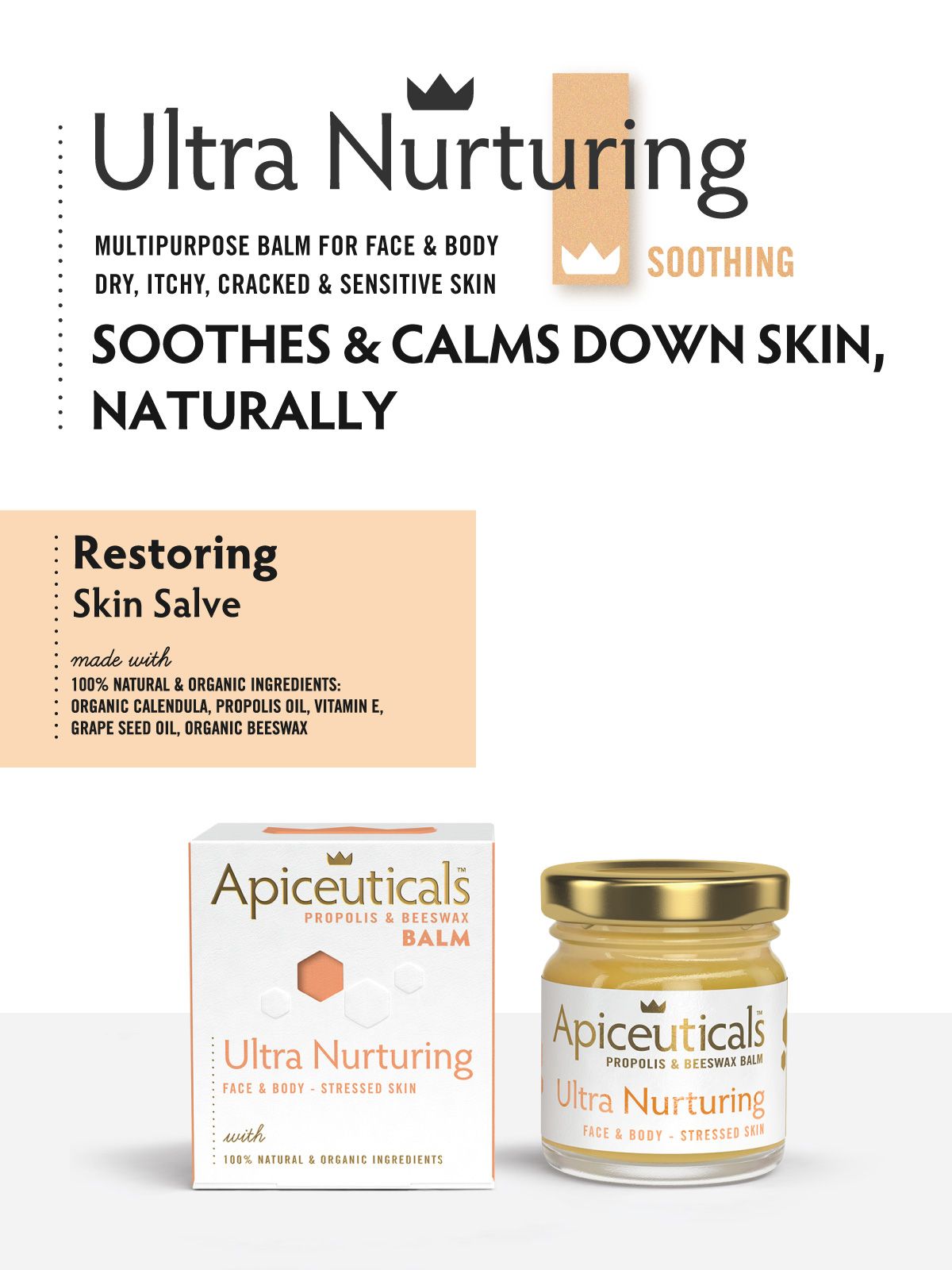 Neaizstājams līdzeklis Tavā mājas aptieciņā. Spēcīgs balzams ar augstu bioloģiskās propolisa eļļas un kliņģerītes koncentrāciju, ar klīniski pierādītām pretiekaisuma, antibakteriālām un pretsēnīšu īpašībām visam ķermenim – sejai, lūpām, pēdām un rokām. Ultra Nurturing Honey Balm aizsargā un nomierina sausu, saspringtu un kairinātu ādu, vienlaikus veicinot ātru un veselīgu atjaunošanās procesu.